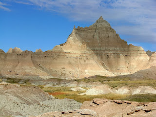 Dnia trzeciego powróciliśmy do Badlands, ponieważ z mapy wynikało, że wczoraj nie zdążyliśmy już przejść krótkiego odcinka Door Trail i choć części dziesięciomilowego Castle Trail. Pustynne widoki i piaskowce, z których zbudowane były góry bardzo przypadły nam do gustu. Mieliśmy tu jedynie w planach spędzenie godziny lub maksymalnie półtora, ponieważ dnia następnego mieliśmy przyjść do pracy, a jeszcze trzeba było wliczyć 12 godzin powrotu samochodem. Do parku narodowego wjeżdżaliśmy tym razem od drugiej strony - od strony Door Trail czy też Exit 131. Poranek w Badlands był przepiękny. Prawie bezchmurne niebo i poranne Słońce nadawało tym górom niepowtarzalnego uroku. Naszą wycieczkę rozpoczęliśmy od Door Trail - krótkiego szlaku, którego zachodzące słońce nie pozwoliło nam poznać wczoraj. Oświetlone szczyty odległych gór zachęcały nas do wędrówki. Będąc na miejscu, poszukaliśmy miejsca, gdzie rozpoczyna się ten szlak. Znaleźliśmy go szybko, bo w całości prowadził niskim chodnikiem zbudowanym z plastikowych listew imitujących drewno. Poszliśmy do jego końca. Szlak kończył się widokową platformą i informacją o możliwych wężach w tej okolicy. Zeszliśmy ze szlaku na ścieżki wydeptane w kierunku Window Trail. Widok z platformy jak i terenów poza nią, ukazywał wielkość tych gór. Dosłownie w każdym kierunku setki szczytów poprzecinanych czerwonymi pasami, tak samo jak pasy składające się z minerałów w mice, zajmowały rozległe przestrzenie. Ten widok przypominał morze szczytów, które nie miało końca. Jedynie za naszymi plecami widzieliśmy dwie góry wyróżniające się swoją wysokością od pozostałych. Właśnie tutaj, poza szlakiem wpadliśmy na pomysł zrobienia niecodziennych zdjęć. Mieliśmy wykonywać skoki z małej półki skalnej tak, aby "trafić" w przełęcz pomiędzy dwoma największymi górami, które znajdowały się za naszymi plecami. Mówiąc "trafić" mam na myśli wizualne uchwycenie naszych sylwetek na tle nieba pomiędzy tymi górami. Zdjęcia wyszły naprawdę efektownie, co ucieszyło nas, bo wyglądaliśmy jak gdyby pomiędzy obiema górami, w połowie ich wysokości, była rozpięta szklana półka - a my na niej.