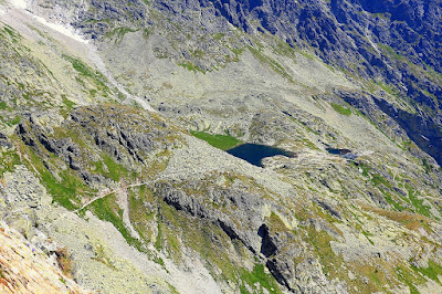 Odcinki dwudziesty drugi i dwudziesty trzeci ubezpieczają cały fragment z klamrami. Dla osób mających lęk wysokości z pewnością tutejsza przeprawa będzie ciężka. Nie występują tu trudności techniczne, gdzie potrzeba dodatkowych umiejętności, ale duże nachylenie i stromizny bardzo działają na psychikę. Warto nie poganiać nikogo na szlaku. Lepiej pójść wolniej ale bezpiecznie. Dwudziesty trzeci łańcuch jest bardzo krótki. Widać, że na klamrach pomyślano o tym, żeby ubezpieczenia były jak najkrótsze, ponieważ nie grozi nam przypadkowy odrzut w razie poluźnienia uchwytu. Dwudziesty czwarty odcinek jest długi (więcej niż 5m) i łączy dwa rzędy klamer, dzięki czemu możemy w poziomie i do góry przejść z dziesięciu klamer na dwie, wyżej położone. Powyżej tych metalowych stopni pójdziemy pod ukosem do góry i w lewo po wystającym zrębie skalnym. Wychodzimy na bardzo niewielkiej półeczce z kępami traw, gdzie możemy tylko na chwilę odpocząć. Nasz szlak ciągle biegnie w lewą stronę i za chwilę ponownie będziemy się męczyć. Dwudziesty piąty fragment jest bardzo długi i prowadzi bardzo stromo do góry podobnymi zrębami i pęknięciami. Dwudziesty szósty odcinek złożony jest z zaledwie kilkunastu ogniw i służy raczej jako przewieszenie pomiędzy wystającą skałą. Dwudziesty siódmy rząd łańcuchów jest wymagający kondycyjnie ponieważ mamy wrażenie, że ściana jest nachylona pod kątem około 70-ciu stopni i tutaj poczujemy bardzo wielką stromiznę. Na końcu dwudziestego ósmego łańcucha widać klamrę, która jednocześnie stanowi punkt zaczepu. Dwudziesty dziewiąty łańcuch dalej prowadzi podobną stromizną i na dodatek skałami o sześciennych kształtach pochylonych w dół. Z pewnością utracimy wiele sił pod koniec. W punkcie zaczepu dwudziestego dziewiątego i trzydziestego łańcucha łączą się obie drogi – górna, którą ludzie schodzą i dolna – właśnie nią przyszliśmy. Od trzydziestego fragmentu idziemy podobną trasą, ponieważ jest wąsko i ciasno. Na wysokości trzydziestego odcinka mamy do dyspozycji niewielki, dość płaski, ale trawiasty teren. Można nieco zejść ze szlaku (około dwa metry w prawo) i odpocząć tutaj. Przy okazji przepuścimy kilku ludzi. Najpiękniejszy jest stąd widok na całą Kotlinę Pięciu Stawów Spiskich oraz wyróżniający się Łomnicki Szczyt. Kiedy robiłem zdjęcie w tym miejscu w kadr przyfrunął motyl z otwartymi skrzydłami i mając w tle Łomnicki Szczyt mogłem zrobić zdjęcie zielonych kęp traw nad przepaścią wraz z kwitnącymi fioletowymi kwiatami. Pomimo tak malutkiego skrawka ziemi jest tu bajecznie kolorowo. Można się tu naprawdę wyciszyć.
