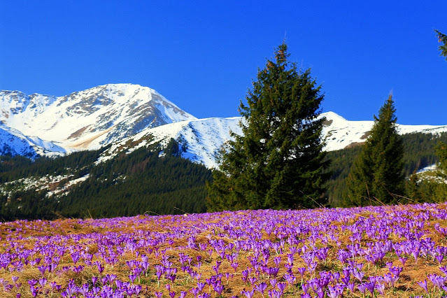 Kwitnące krokusy na Kalatówkach w Tatrach