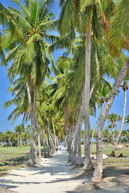 Poznając wyspę podczas kolejnych dni, odkryliśmy jeszcze dwie kolejne aleje palmowe. Pierwsza z nich znajdowała się w drodze na dużą plażę (na mapie nr 4), kiedy skręciliśmy w lewo, wychodząc z naszego domku. Wzdłuż gęstej alei, po prawej stronie podziwialiśmy niezwykły palmowy las, który tworzył idealny motyw na ścienną tapetę. Dziesiątki, samotnie rosnących plam tworzyło piękną mozaikę. Pomiędzy nimi znajdowały się zielone uprawy warzyw i papai. Ile razy tamtędy przechodziłem, tyle razy fotografowałem to miejsce. Niestety podczas ostatniego dnia pobytu (12.03.2021) miejscowi wycięli wszystkie palmy, żeby uzyskać jeszcze więcej miejsca pod uprawy. Można powiedzieć, że wspaniałe miejsce znikło bezpowrotnie… Dobrze, że zdążyłem jeszcze uwiecznić je w obiektywie. Monika, siostra Basi, pewnego wieczoru przy tym pięknym lesie usłyszała śpiew miejscowego, jadącego na skuterze na pole. Cały czas używał jednego słowa, które było bardzo podobne do polskiego „kalarepa”. Monika bardzo szybko podchwyciła tą przyśpiewkę i przez całą długość alei i drogi do guest house śpiewała na głos: „kalarepa, kalarepa…”. Wszyscy się śmialiśmy z tego, bo z niczego powstało coś fajnego i wesołego. Druga aleja znajduje się około 150 metrów dalej, po lewej stronie, równolegle do naszej alei, prowadzącej na główną plażę (na mapie nr 5). Jest jeszcze piękniejsza, ponieważ po obu stronach tworzy ją skupisko okazałych palm po obu stronach. Aleja kończy główną ulicę całej wioski, która prowadzi do meczetu. Właśnie na niej mamy największy ruch miejscowych, ponieważ, idąc wzdłuż niej, znajdziemy dwa większe markety, mniejsze sklepy, trafimy do apteki i szpitala (na mapie nr 12), do lokalnej elektrowni (na mapie nr 15), na boisko piłkarskie oraz do meczetu (na mapie nr 2). Jest też najszersza z nich. Aleja jest niezwykle fotogeniczna, dlatego i tutaj spędziłem trochę czasu na łapaniu dobrych ujęć. Na samym jej końcu, przy plaży, gdzie miejscowi wodują swoje łodzie, znajduje się stacja uzdatniania wody dla całej wioski. Poznamy ją po wysokich na kilka metrów zbiornikach w kolorze niebieskim i zielonym (na mapie nr 3).