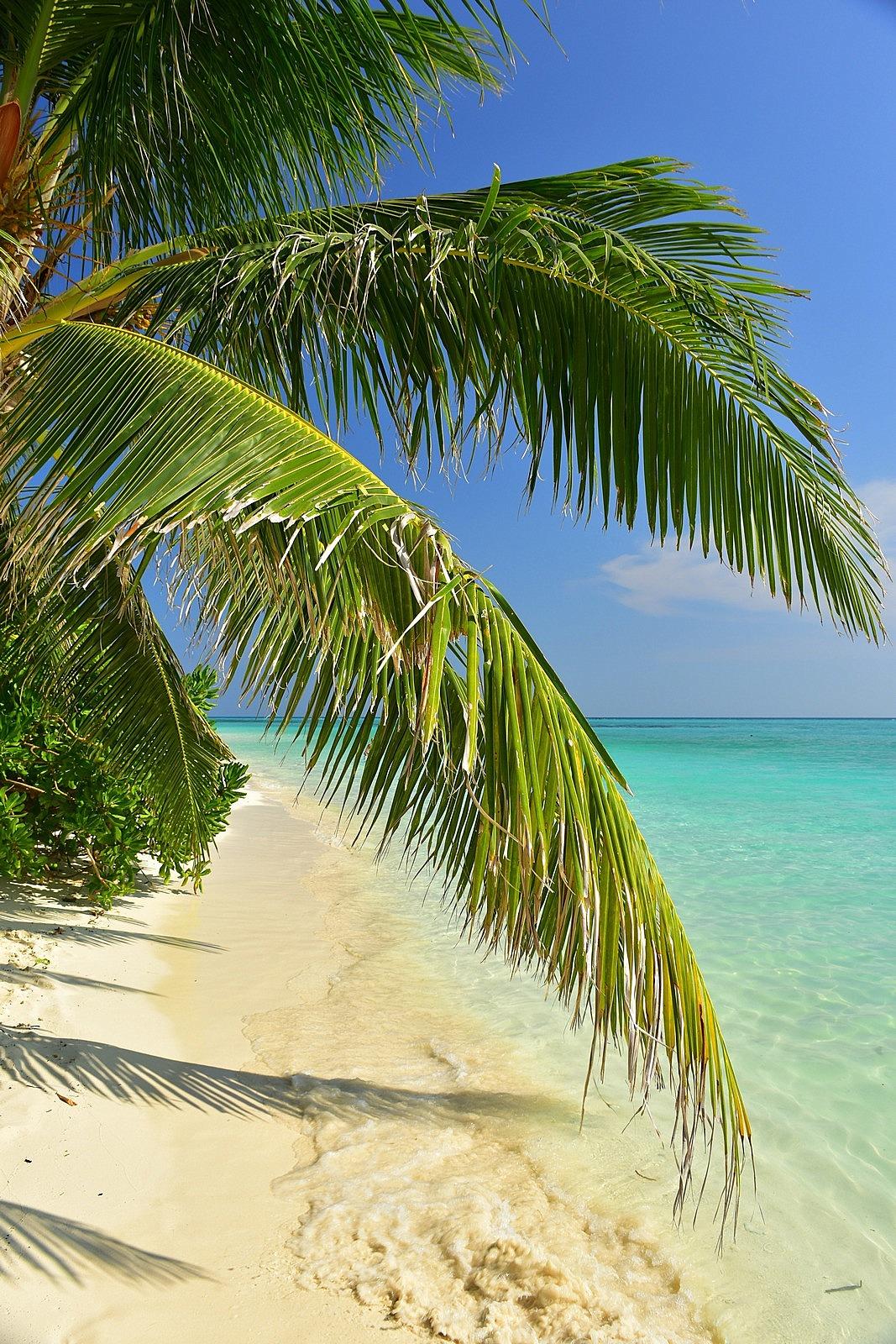 Kiedy kupimy sobie „kokoska”, możemy wejść ścieżką usypaną z piasku na plażę. Przy sklepiku widnieje piękny napis THODDOO utworzony z niskich, zielono-fioletowych roślin. Nie masz wątpliwości gdzie jesteś. Ścieżka na plażę jest malownicza, ponieważ z obu stron krawężnikami są te same, liściaste rośliny, a dalej widać tylko piękne palmy. Za chwilę widzimy niesamowicie turkusowe laguny i biały piasek. Po prostu chłoniemy oczami piękno tego miejsca. Idąc ciągle w prawo, pójdziemy plażą przez około 300 m. Wszędzie, przy linii brzegowej, będą leżaki, hamaki i huśtawki. Moim zdaniem, to miejsce jest najpiękniejsze na całej wyspie. Cały teren zdobią wysokie i równe, lekko pochylone palmy, a pomiędzy nimi wszędzie mamy, drobny, biały piasek. Aż chciałoby się położyć tu i teraz, ale czym bardziej idziemy wzdłuż plaży, tym coraz piękniejsze miejsca odkrywamy. Uważam, że ostatni fragment plaży, na samym końcu, jest najpiękniejszy. Jest tam pochylona palma nad turkusowymi wodami, mnóstwo innych palm, biały piasek, stolik i ławki, żywo-zielone krzaki, i dwa wspaniałe zejścia do wody pomiędzy palmami. Coś pięknego! Dodatkowo mamy gdzie suszyć ręczniki, ponieważ w wielu miejscach rozciągnięto sznurki do suszenia ubrań pomiędzy palmami. Schodząc do wody, widzimy, jak bardzo czysta jest woda. Widać podwodne fałdy piasku tworzone przez małe fale. Ciągną się one w postaci równoległych pasów wzdłuż linii brzegowej. Cały widok wzbogacają żywo-zielone krzaki, które idealnie komponują się z białym piaskiem, niebieskim niebem i turkusową laguną. Nie trzeba nawet wspominać, że kolorowe ryby w tych wodach są na porządku dziennym. Wystarczy popłynąć 10 m od brzegu, a już będziemy mogli obserwować ryby, które zapuściły się dalej od swoich raf koralowych, z których najczęściej przybywają w stronę plaży. Wody są płytkie. Można iść dnem około 20 m od brzegu. Później trzeba płynąć. Miejsca nie brakuje, ponieważ plaża jest długa i nie ma tłumów. Cały ruch turystyczny przerzedza się na całej tej powierzchni. Polecam popłynąć jakieś 20-30 m od brzegu, żeby zobaczyć jak wygląda wyspa z poziomu laguny. Jest po prostu bajecznie piękna, ponieważ widzimy rzędy wysokich palm, a pomiędzy nimi, gęste, zielone krzaki, które na początku marca kwitną na biało. Idąc wzdłuż całej plaży, zatrzymuj się przy każdej huśtawce w wodzie, ławce, czy pochylonej palmie. Podobnych miejsc jest więcej, a każde z nich pozwala zobaczyć coś podobnego, ale innego. Moim zdaniem tutejsza plaża jest idealnym miejscem dla fotografów krajobrazowych. Z łatwością można wykonać tu katalogowe zdjęcia bez zbędnych przeróbek.