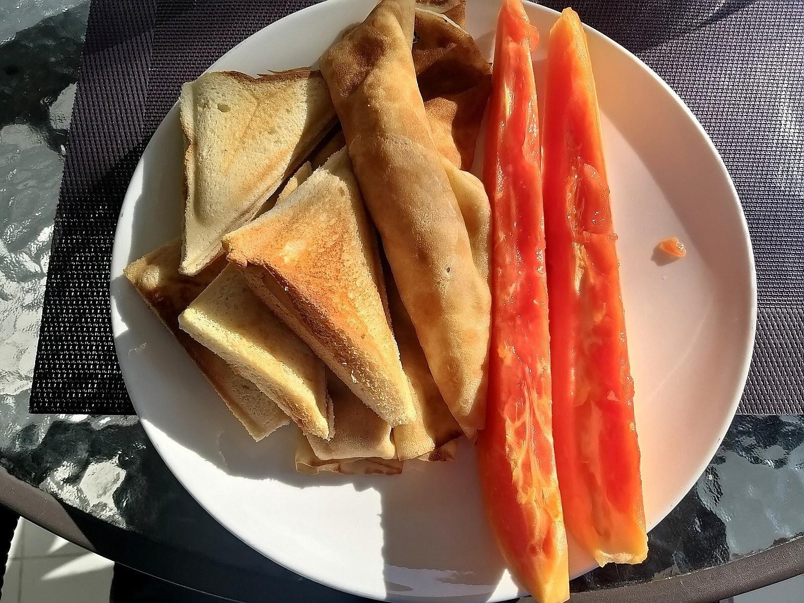 Śniadanie (naleśniki z bananami, sandwitche z tuńczykiem i papaje). Sami nakładamy sobie porcje