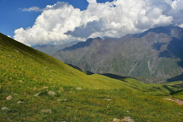 Około godziny 12.00 postanowiliśmy, że pomału musimy wyruszać, żeby móc spokojnie dotrzeć do poziomu 3000 m n.p.m. Od początku miałem takie założenie, aby nie gonić się z czasem. Chciałem, żeby każdy z nas mógł cieszyć się pięknymi widokami, miał czas na wykonanie zdjęć oraz na wypoczynek. Założyliśmy za ciężkie dziady na plecy, wydając przy tym charakterystyczne odgłosy, świadczące o walce z nimi (do samego końca nie wiedzieliśmy, czy za ciężkie dziady walczą z nami, czy my z nimi). Wyruszyliśmy po godzinie 12.15. Początkowy fragment rozpoczął się dość stromym, ale trawiastym zboczem. Wystarczyło iść do góry z ciężarem na plecach. Od razu zaczęliśmy się pocić. Po prawej stronie pierwszego zbocza widać dużo krzaków, które tworzą zwarte skupisko. Tuż pod szczytem pierwszego wzniesienia ścieżka rozgałęzia się na dwie. Można iść drogą poprowadzoną przez zarośla. Wtedy zobaczymy tam bardzo ciekawy fragment, gdzie krzaki mają wygięty pień przy samej ziemi. Mamy wówczas wrażenie, że zwarta struktura płynie. Wybierając lewą ścieżkę, idziemy typowo grzbietem przez porośnięty teren żywo-zielonymi trawami. Zdecydowaliśmy, ze pójdziemy grzbietem, ponieważ ciągle mieliśmy mieć piękne widoki. Ze szczytu pierwszego lokalnego wzniesienia, mogliśmy popatrzeć na parking z góry oraz na kościółek i drogę dojazdową. Teraz widzieliśmy ile taksówek stoi u bram Tsminda Sameba oraz dwa konie na środku ulicy. Rozpoczynając wędrówkę w stronę Kazbeku trzeba pamiętać, że od drewnianych ławek są dwie możliwe drogi. Można iść opcją, którą my wybraliśmy, czyli grzbietem, a można wybrać wędrówkę polną drogą za parkingiem. Nie polecam tej możliwości, ponieważ przez dłuższy czas będziemy szli w dolinie, a później będziemy musieli bardzo stromym zboczem nadrabiać wysokość. Dodatkowo w połowie doliny widać jakąś chatę i ogródek warzywny, którego pilnuje pies pasterski. Nigdy nie wiadomo jak się zachowa, dlatego lepiej wybrać wędrówkę grzbietami. Szybciej osiągniemy wysokość i ciągle będziemy podziwiać piękne widoki.